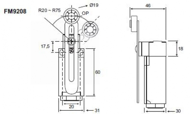 Produtos / Chaves Fim de Curso / Chave Fim de Curso Metaltex / Família FM9 / Fim de Curso FM9208